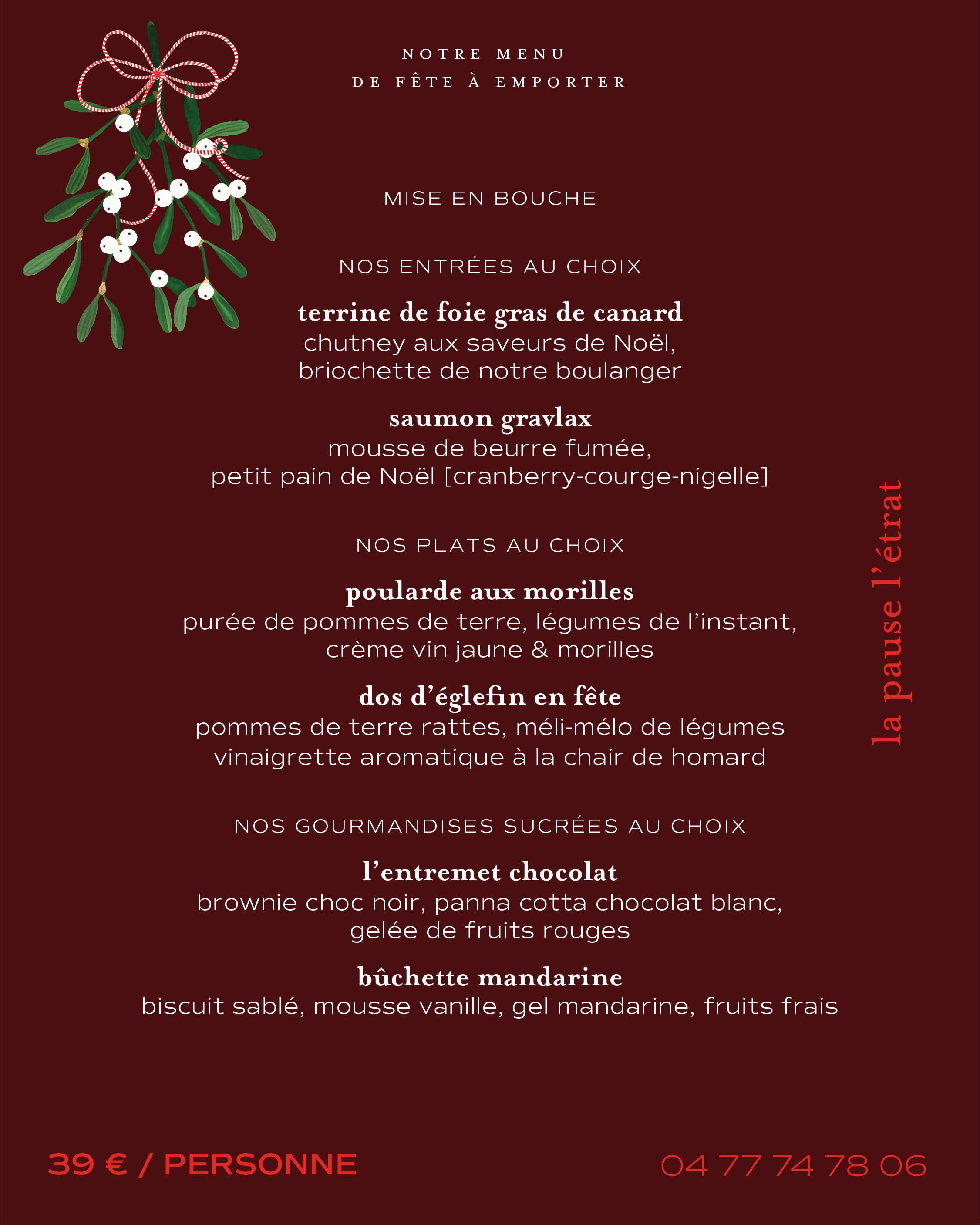 Pour les fêtes, La Pause s’invite chez vous, et vous propose son menu à emporter spécial « fêtes ».